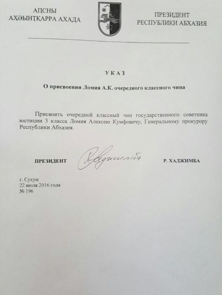 Указом Президента Республики Абхазия Хаджимба Р.Д. Генеральному прокурору РА Ломия Алексею Кумфовичу присвоен очередной классный чин государственного советника юстиции 3 класаа.