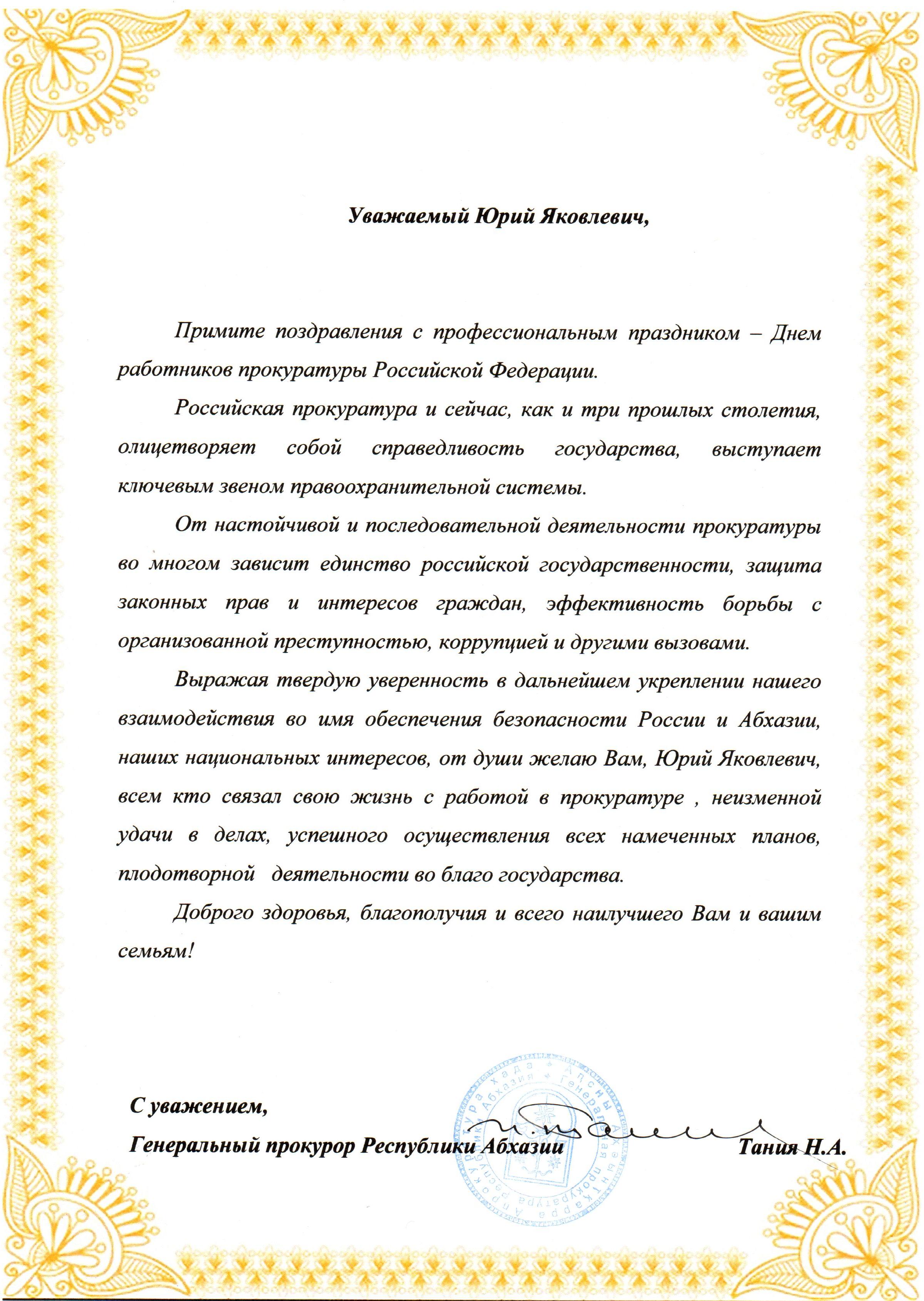Выражая твердую уверенность в дальнейшем укреплении нашего взаимодействия во имя обеспечения безопасности России и Абхазии, наших национальных интересов, от души желаю Вам, Юрий Яковлевич, всем кто связал свою жизнь с работой в прокуратуре , неизменной удачи в делах, успешного осуществления всех намеченных планов, плодотворной деятельности во благо государства.