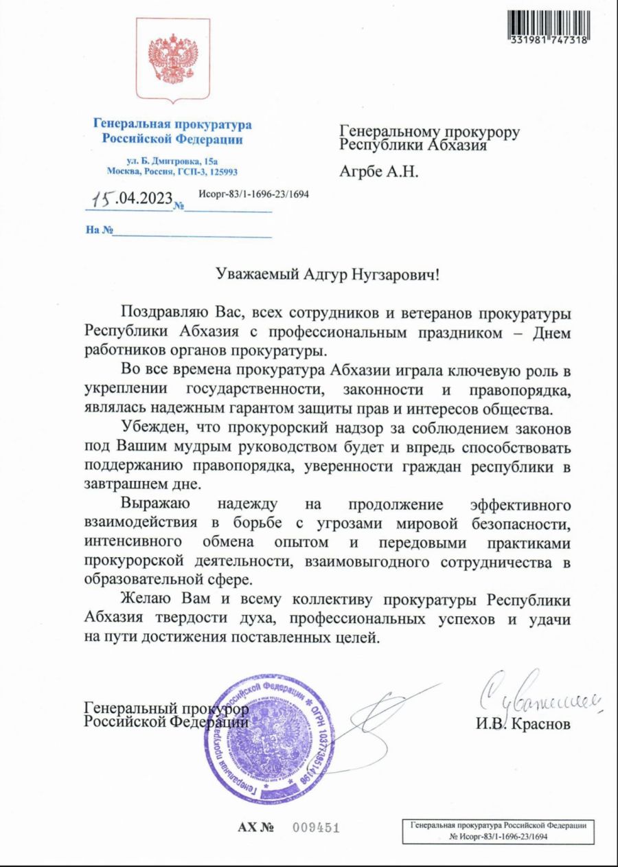 Генеральный прокурор Российской Федерации Краснов И.В. поздравил Генерального прокурора Республики Абхазия Агрба А.Н. с профессиональным праздником!