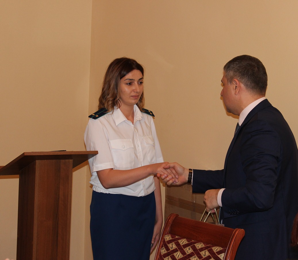 По завершению чтения присяги Первый заместитель Генерального прокурора РА Аршба Г.В. поздравил молодого специалиста, пожелал ей успехов в работе, карьерного роста и вручил ему памятный подарок.